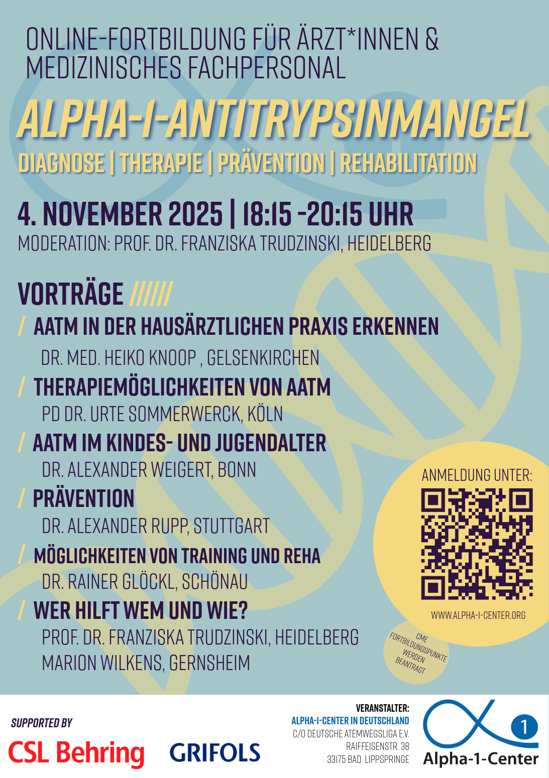 Am 04.11.2025 führen die Alpha-1-Center in Deutschland ein kostenloses Online-Seminar für Ärzt*innen und Medizinisches Fachpersonal zum Thema "Alpha-1-Antitrypsinmangel | Diagnose | Therapie | Prävention | Rehabilitation" durch. Von 18:15 Uhr - 20:15 Uhr widmen sich Experten in sechs Vorträgen vielen Bereichen dieser seltenen Erkrankung. Anmeldungen: https://attendee.gotowebinar.com/register/8824814915487059032 Machen Sie gern auch hausärztliche Kolleg*innen und Mitarbeiter*innen auf dieses Angebot aufmerksam. CME-Fortbildungspunkte werden beantragt.